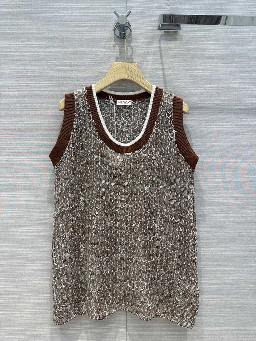 Exclusive Launch 🍒 High end original quality! Walking high definition bro * ello cu * inelli23 spring and summer mermaids 🧜♀️ Shining fish scale sequin knitted long tank top, with a layered design that is a masterpiece! Heavy Industry Luxury Jue Jue Zi! Imported yarn with Swiss woven craftsmanship and ribbed patchwork collar design create a youthful and luxurious sense of luxury! The loose fit is effortless and elegant. Classic and flawless upper body looks super slim, all in one size s-l. Size m: Bust 102, length 70.