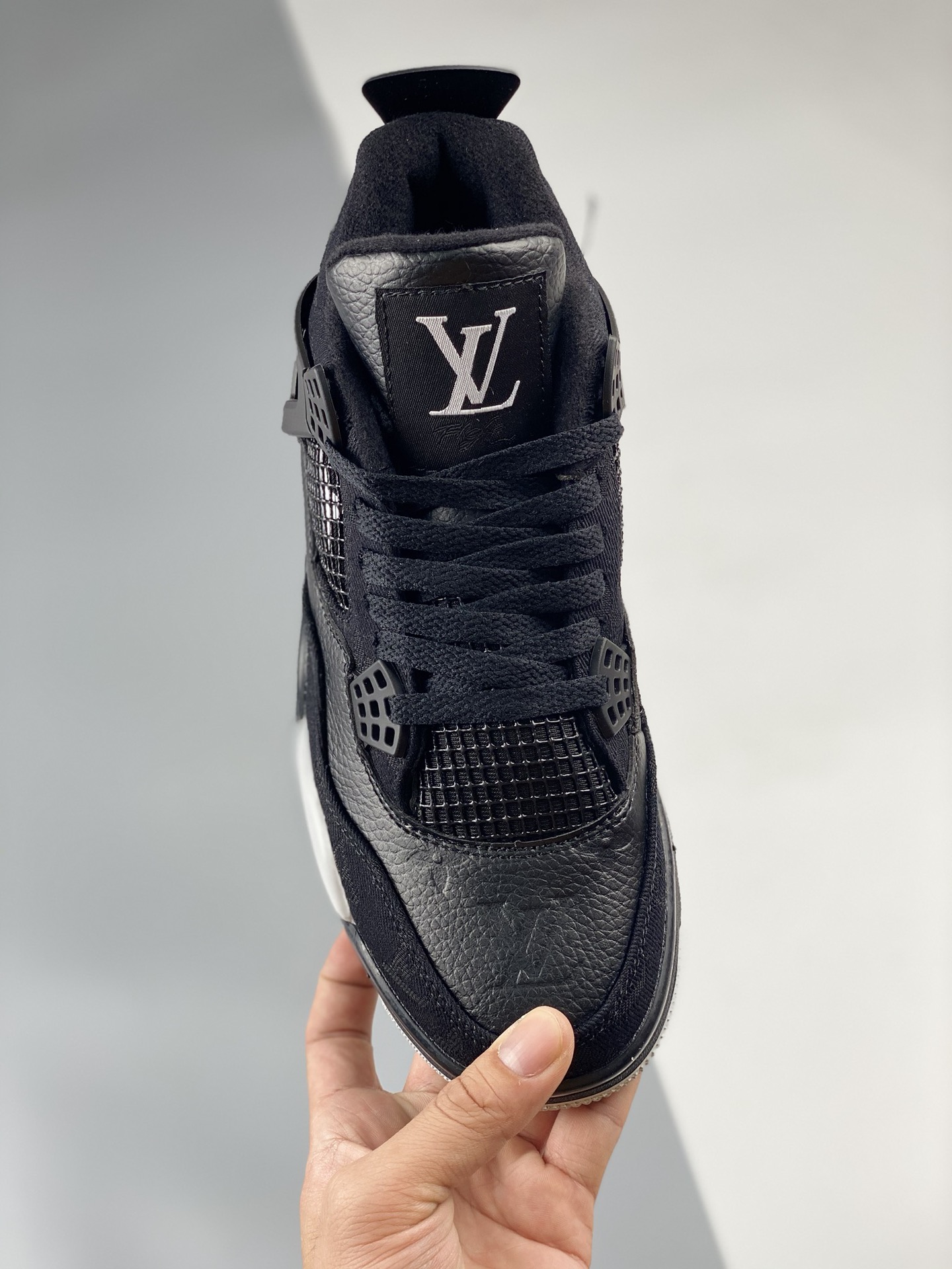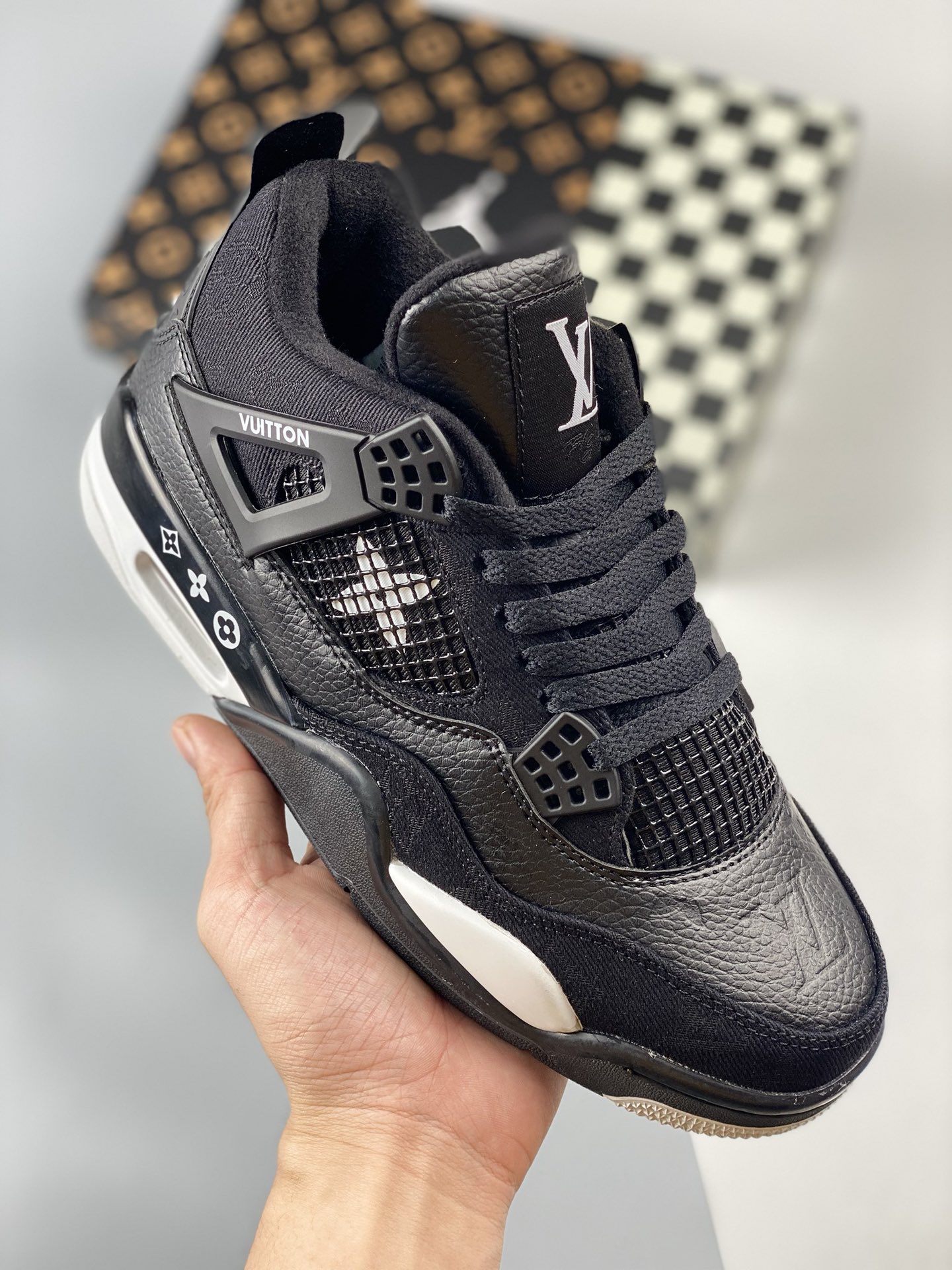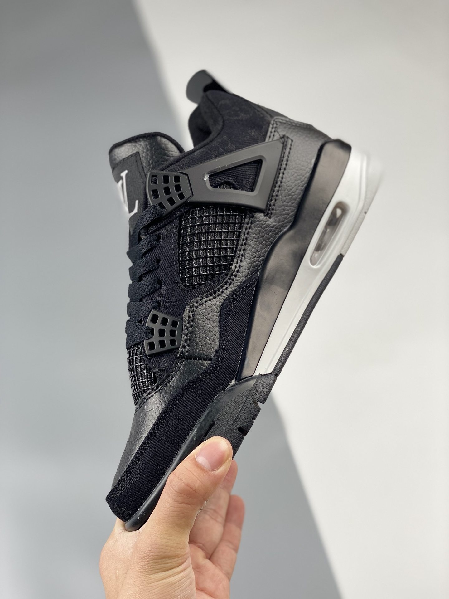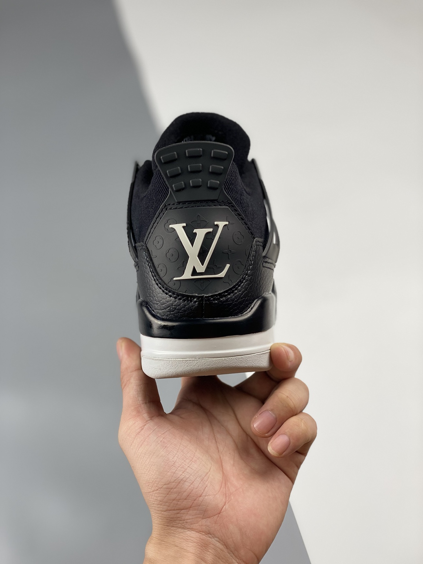The Air Jordan 4 retro lv black co branded basketball shoe series is made of leather material, with a white lv print on the upper as the main frame, and the mesh material on the tongue and middle section of the shoe body also adopts a black scheme. Pair with white shoelaces to give the entire shoe a more overall look. The black label on the top of the tongue is printed with the words' lv 'to demonstrate joint identity. The TPU decoration on the shoelace hole is made in black for a more detailed feel. Product number: lv6927-001 Size: 36-47.5 with half size