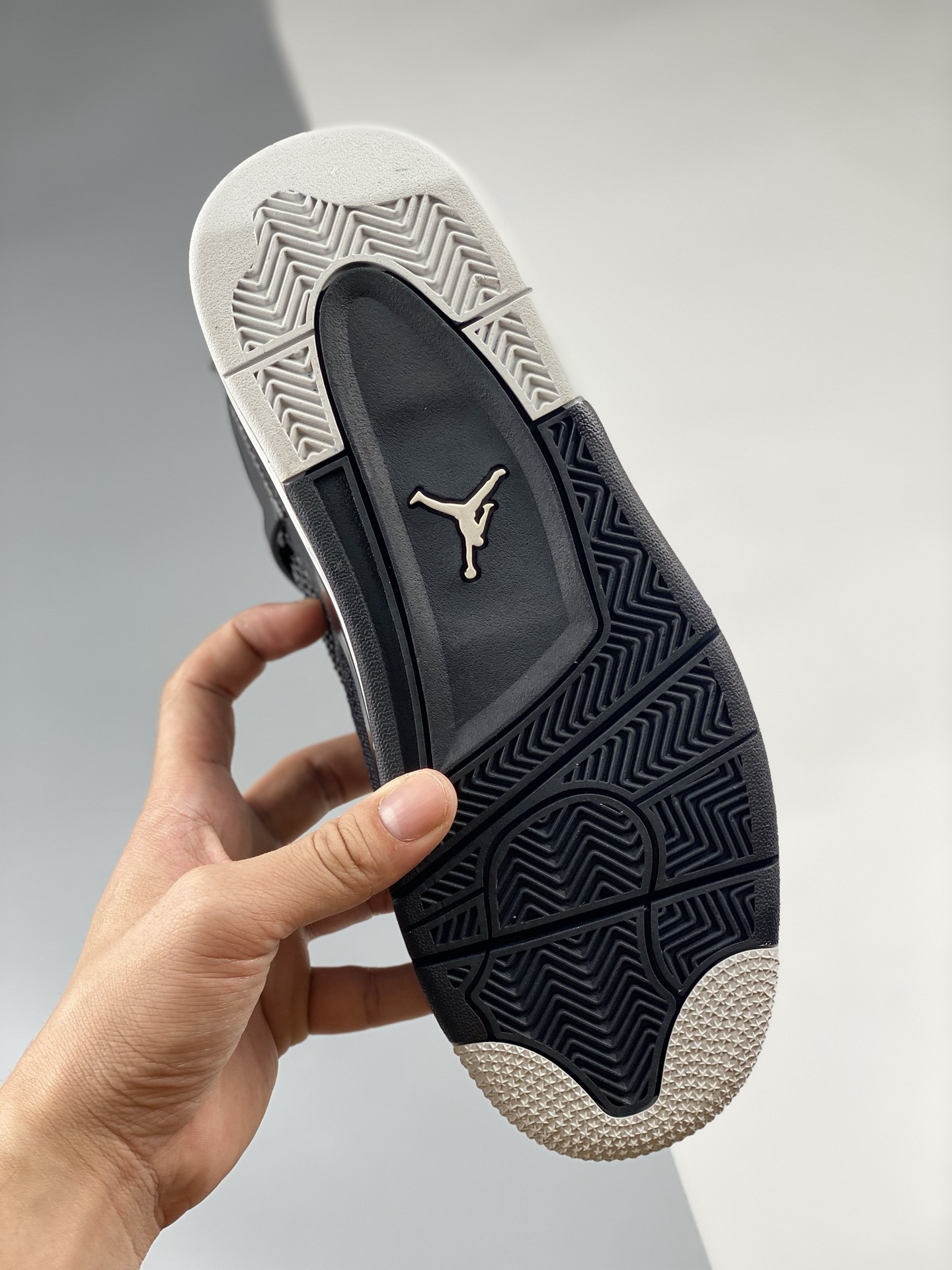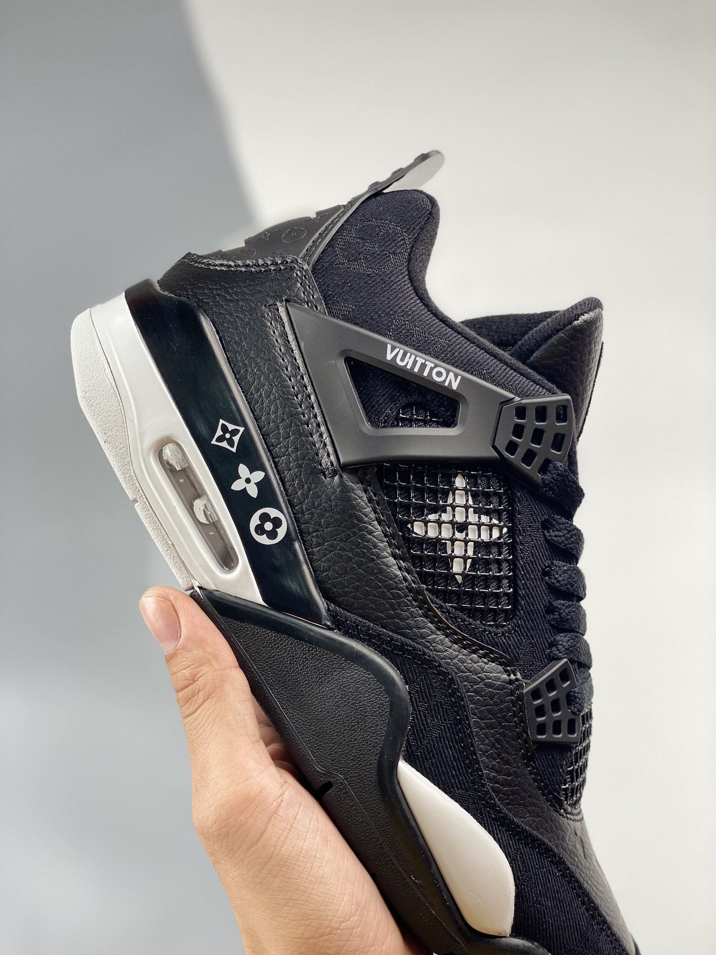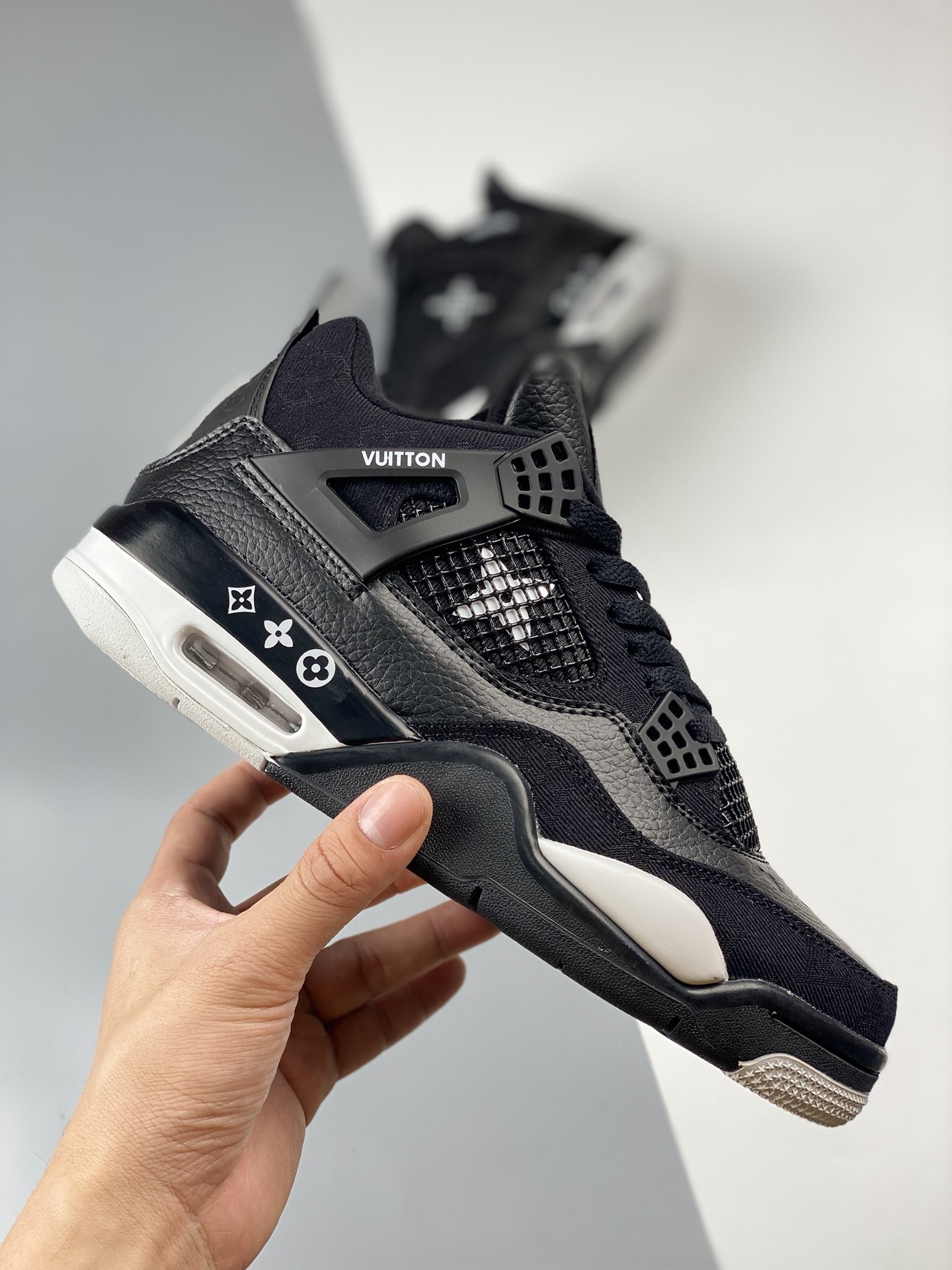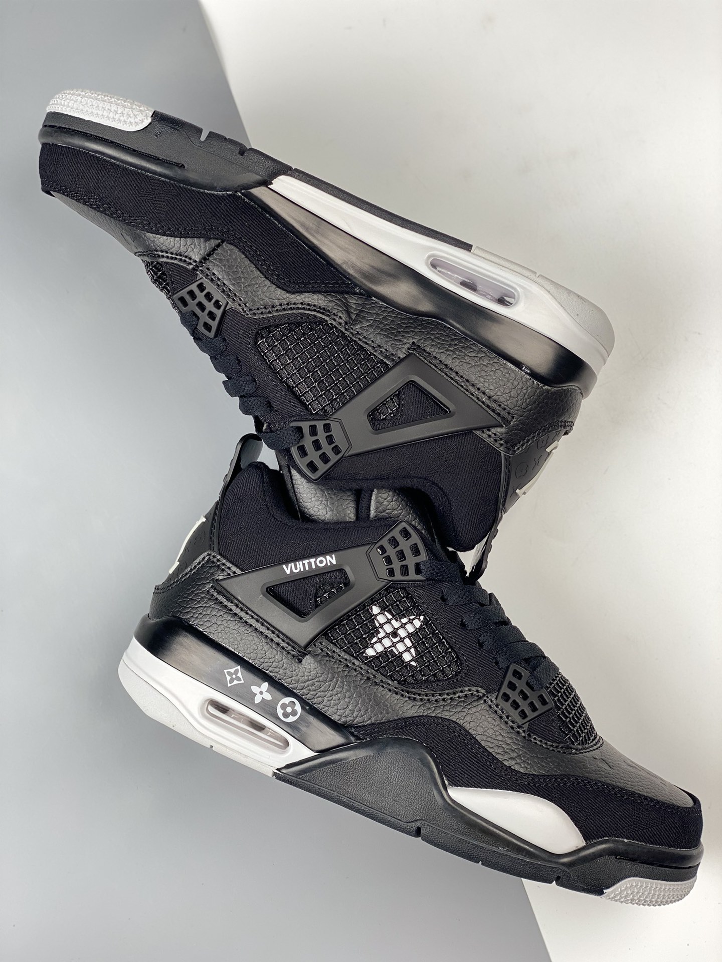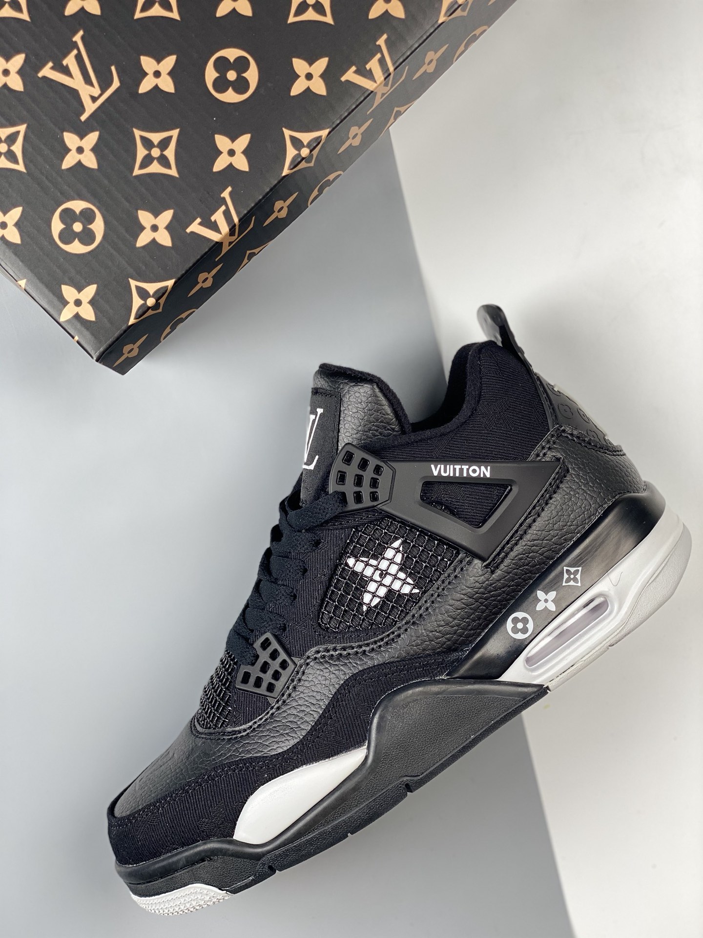 The Air Jordan 4 retro lv black co branded basketball shoe series is made of leather material, with a white lv print on the upper as the main frame, and the mesh material on the tongue and middle section of the shoe body also adopts a black scheme. Pair with white shoelaces to give the entire shoe a more overall look. The black label on the top of the tongue is printed with the words' lv 'to demonstrate joint identity. The TPU decoration on the shoelace hole is made in black for a more detailed feel. Product number: lv6927-001 Size: 36-47.5 with half size