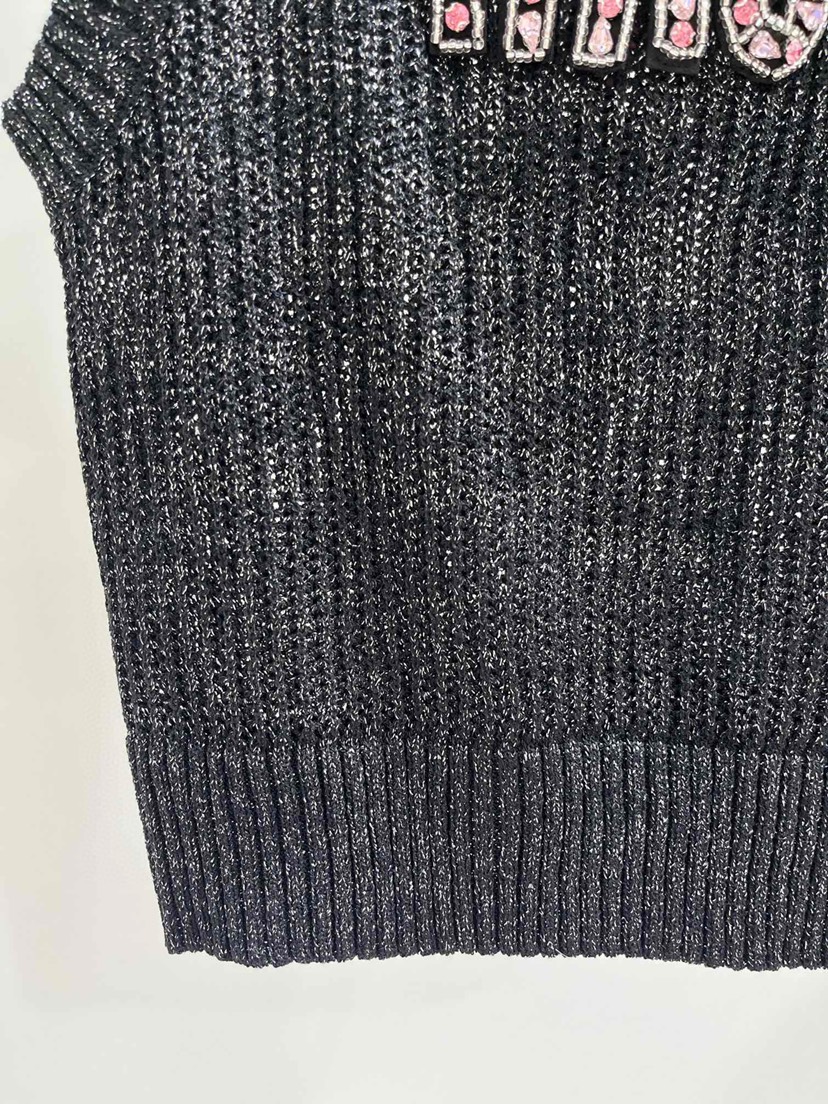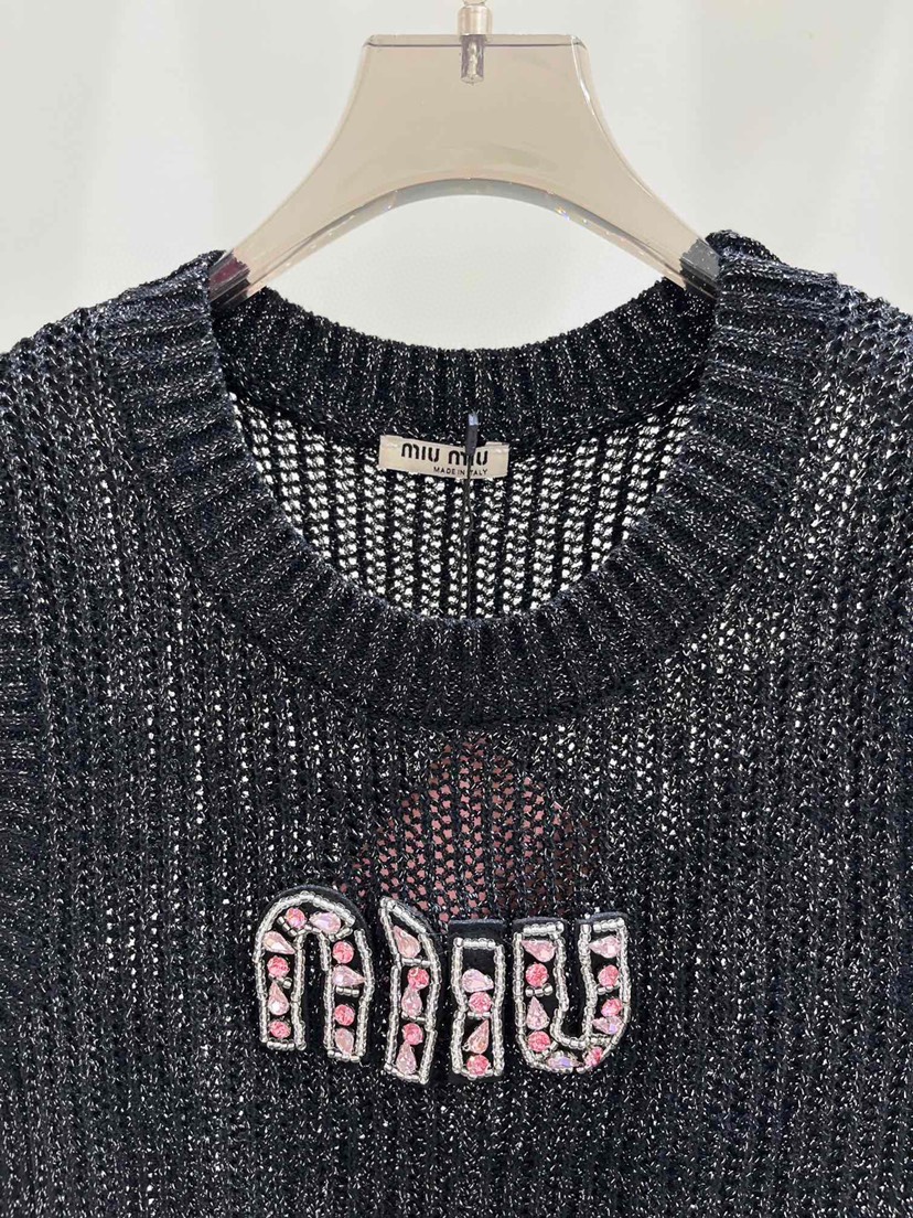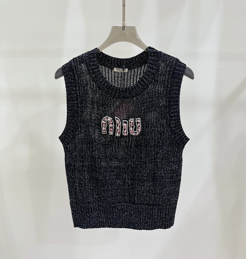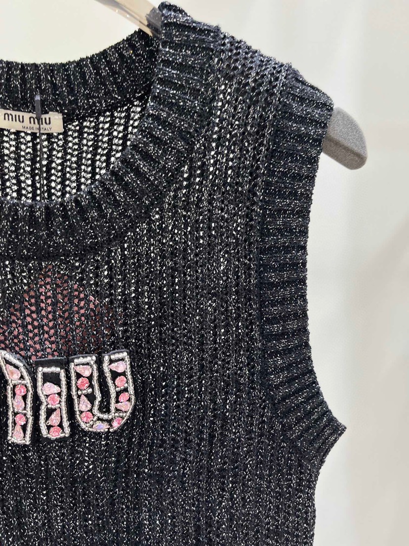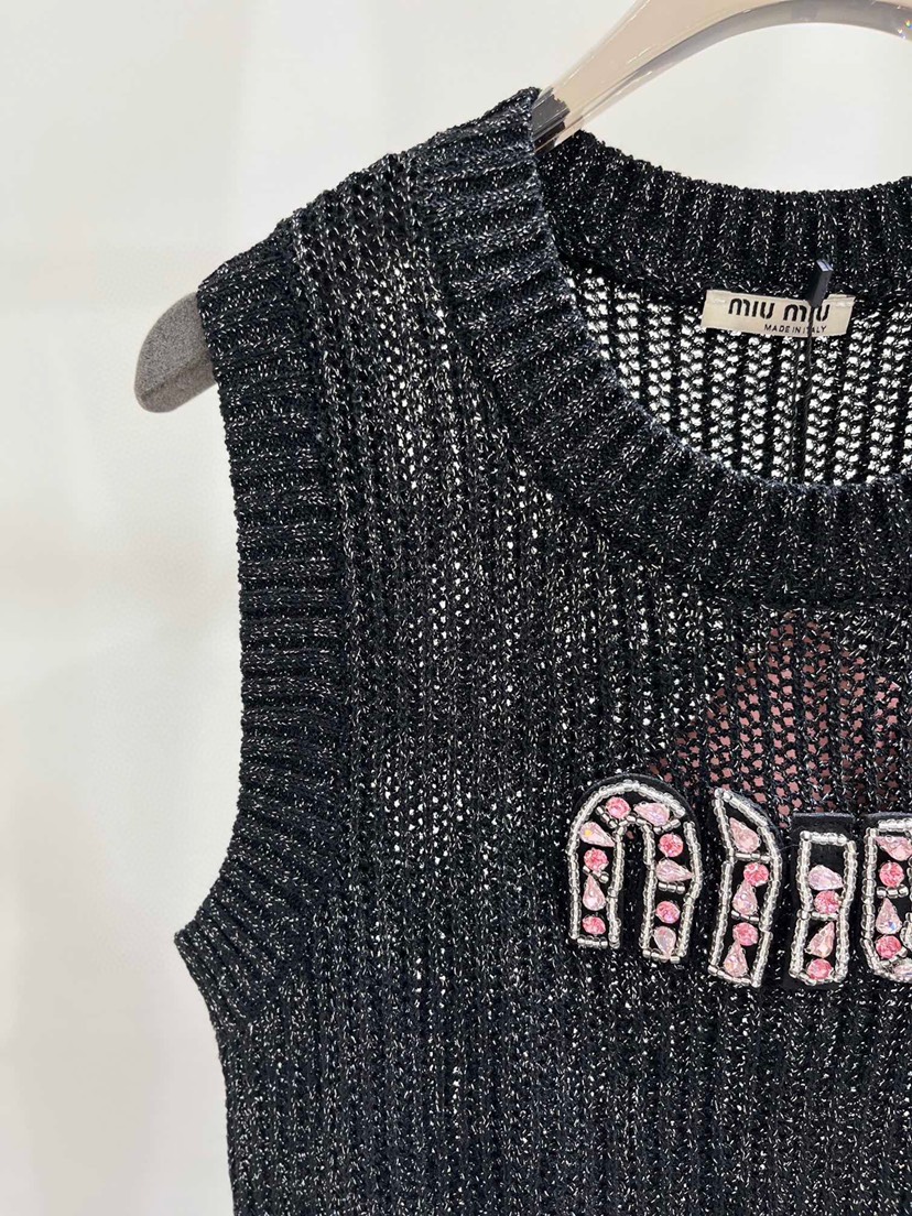 DetailExclusive debut Miu Miao 23 Summer New Pink Rhinestone Letter Hollow Knitted Tank Top in One Color Three Sizes