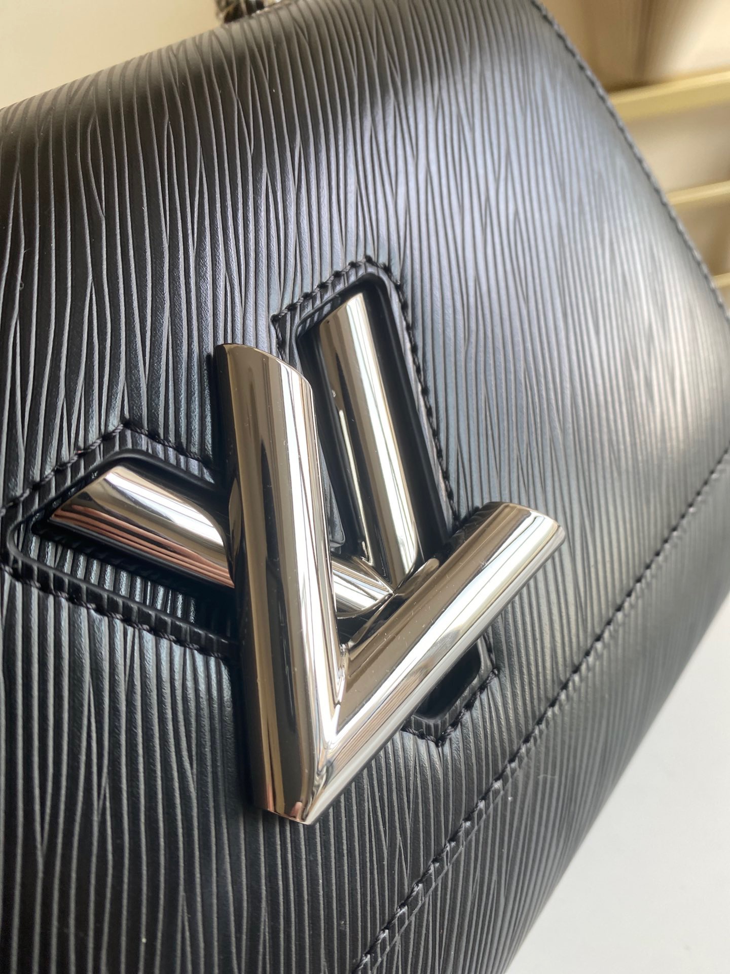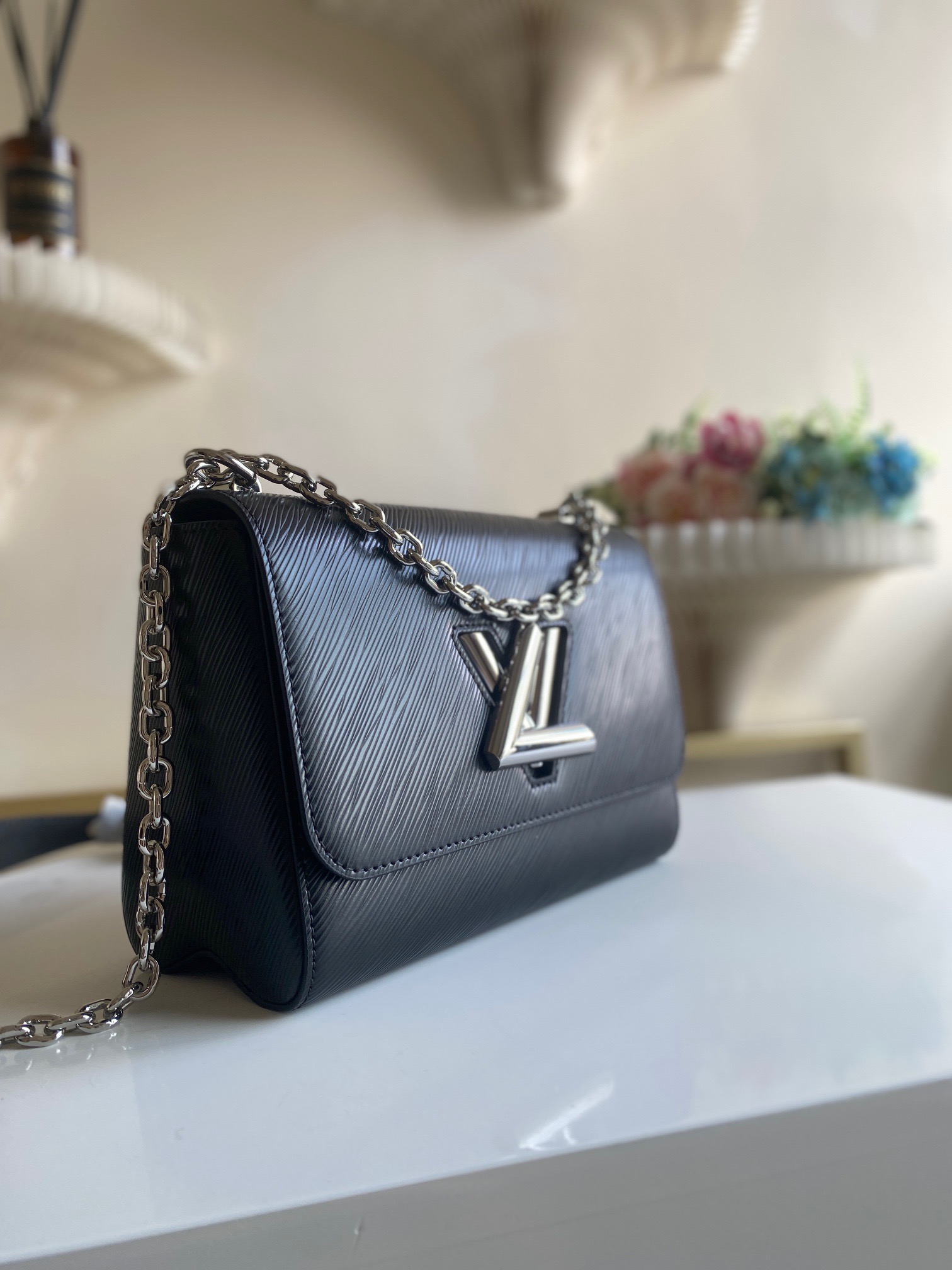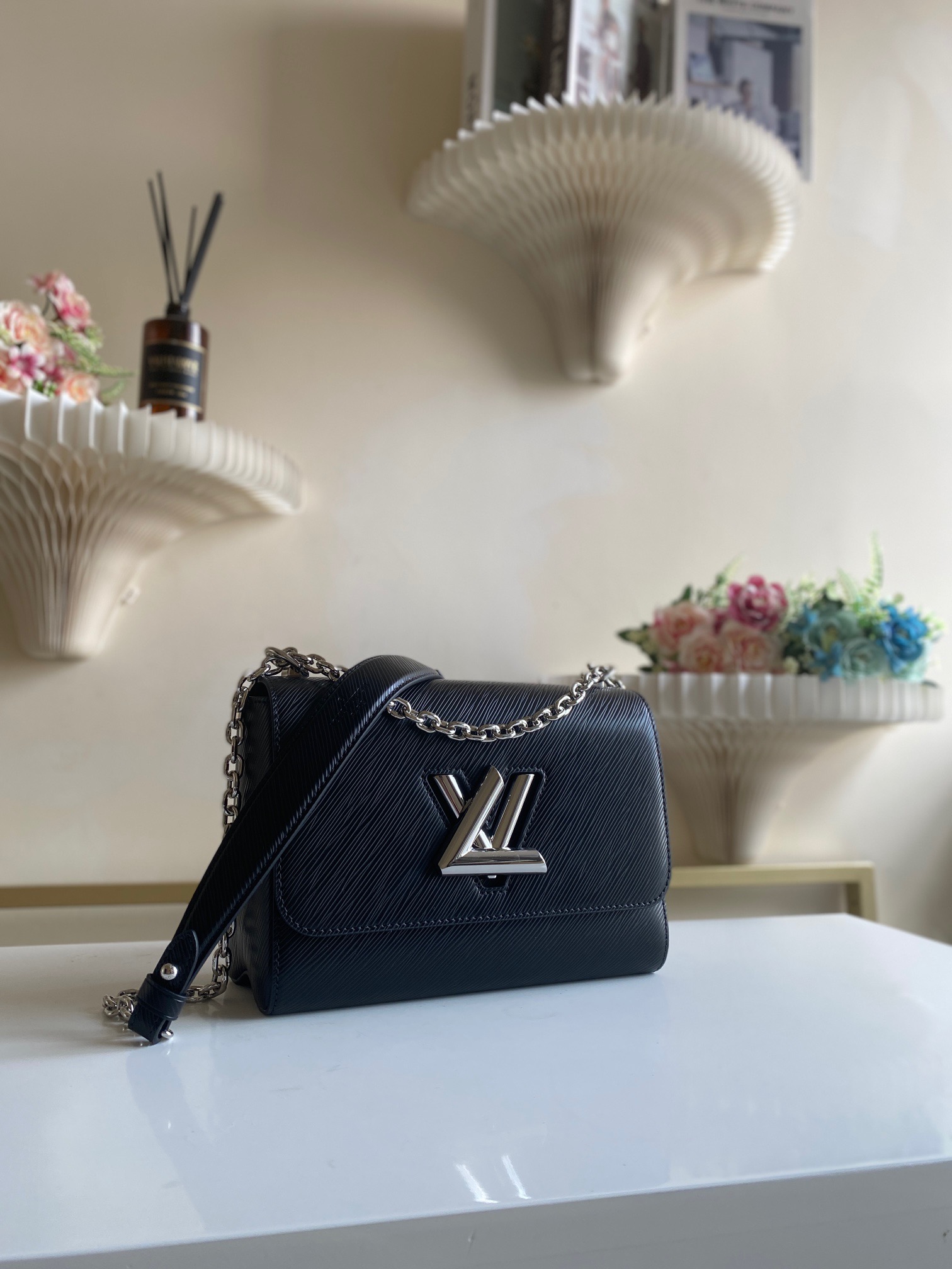 P850. Twist medium handbag m21110 black silver buckle twist m50282 chain bag first announced the Neoclassicism fashion in the 2015 cruise early spring series. This medium-sized handbag is made of brand iconic EPI leather and adorned with a sculptural twist lock, releasing a metallic shine. The hidden capacity mystery of the wavy bottom package; The sliding chain shoulder strap is folded or unfolded for a shoulder to shoulder or crossbody experience, presenting a beautiful appearance in day and night occasions. Size: 23 x 17 x 9.5cm