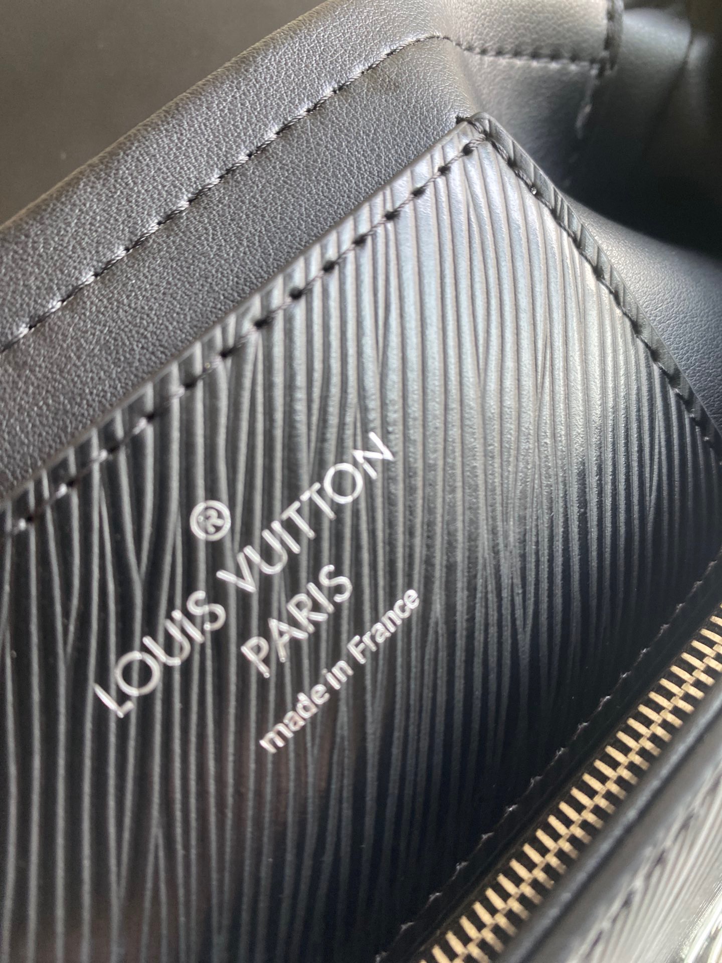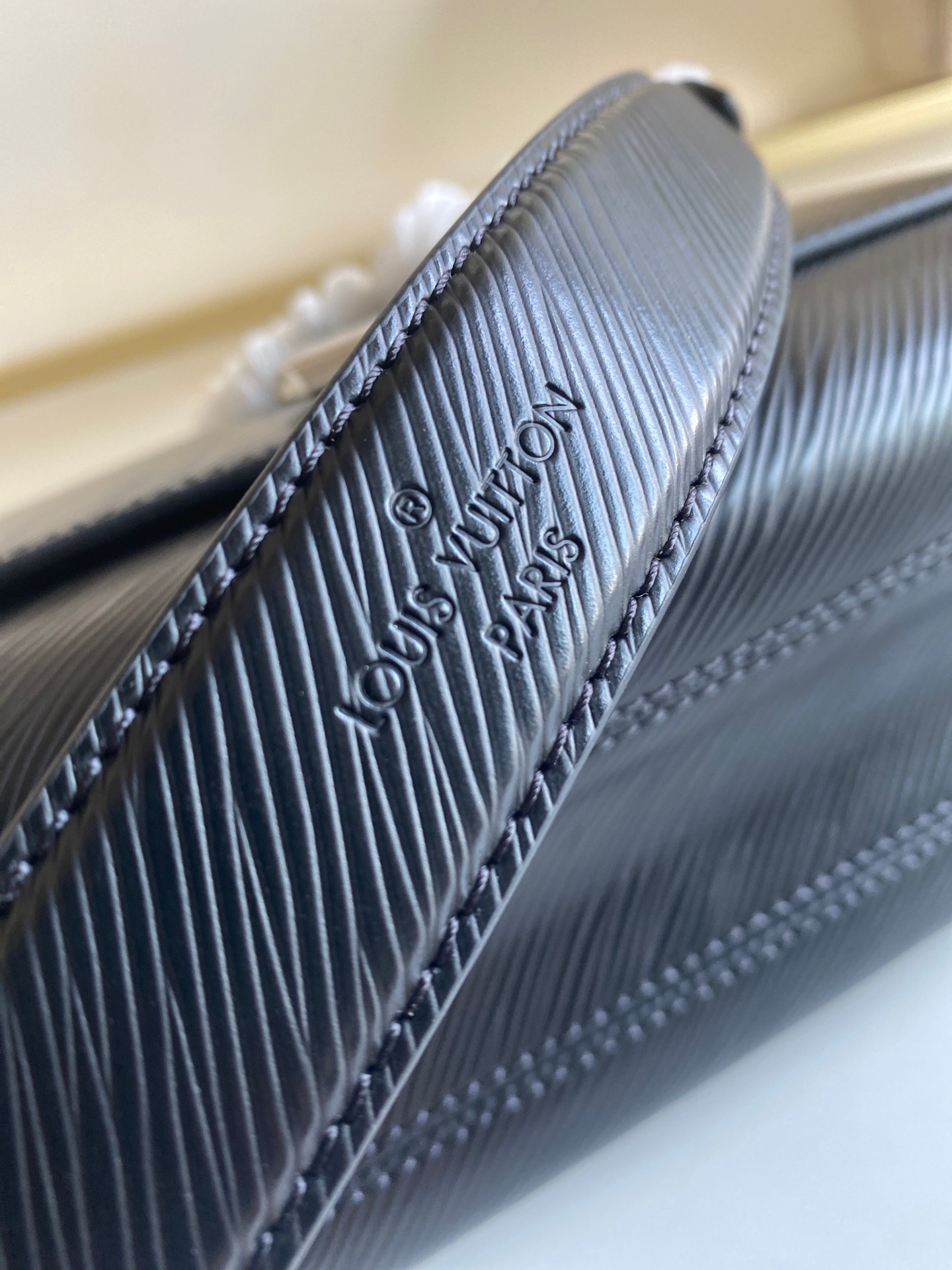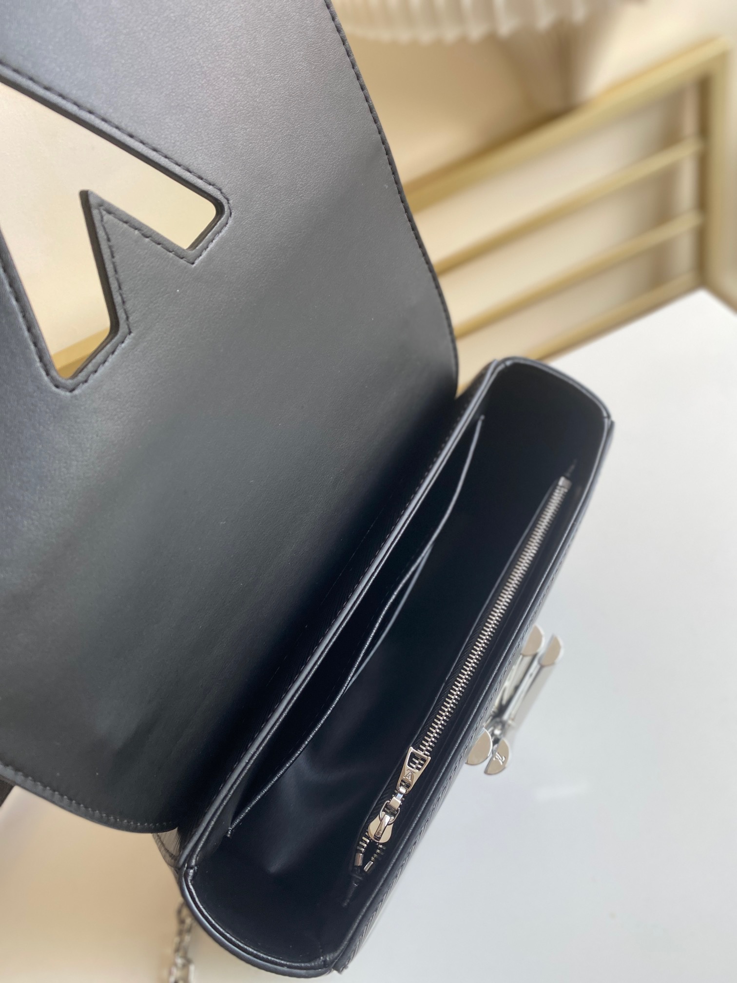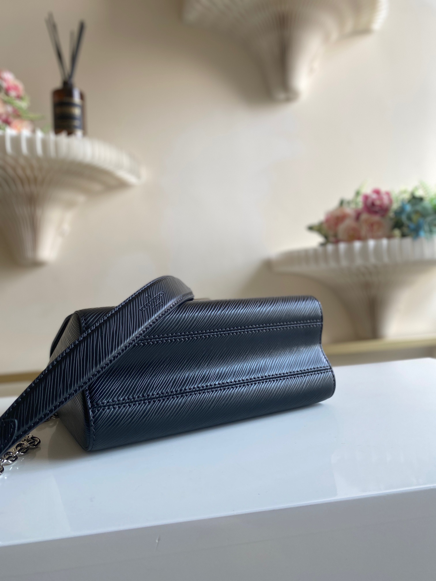 P850. Twist medium handbag m21110 black silver buckle twist m50282 chain bag first announced the Neoclassicism fashion in the 2015 cruise early spring series. This medium-sized handbag is made of brand iconic EPI leather and adorned with a sculptural twist lock, releasing a metallic shine. The hidden capacity mystery of the wavy bottom package; The sliding chain shoulder strap is folded or unfolded for a shoulder to shoulder or crossbody experience, presenting a beautiful appearance in day and night occasions. Size: 23 x 17 x 9.5cm