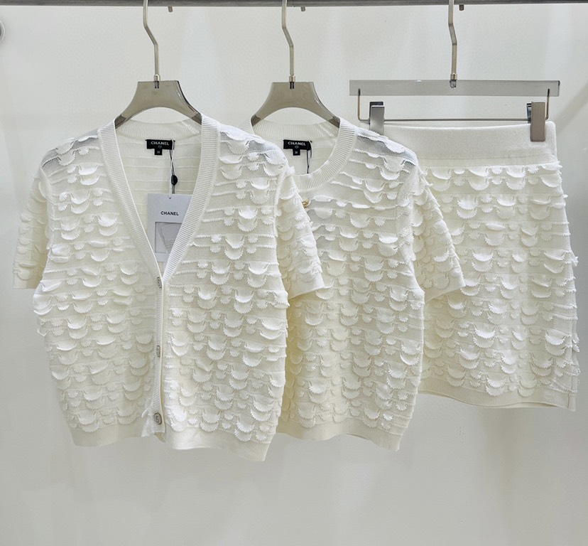 Exclusive Launch ❤️ Chanel23 Summer New Simple Fragrance Style Reduced Age Fish Scale Knitted Short Sleeve ➕ Half skirt, a must-have item for white richness and beauty, with high-end quality and detailed live shot display
